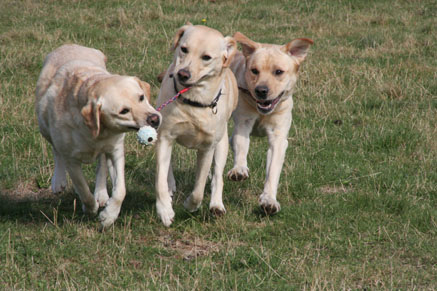 Oskar besucht seine Familie Bei schönstem Sonnenschein toben die vier Hunde über die Wiese. Während Ashley sich mit ihren 9 Jahren nach einiger Zeit absetzt um Grashüpfer zu fangen, jagen Dana, Tochter Jessie und Sohn Oskar unermüdlich hinter dem Ball her. |